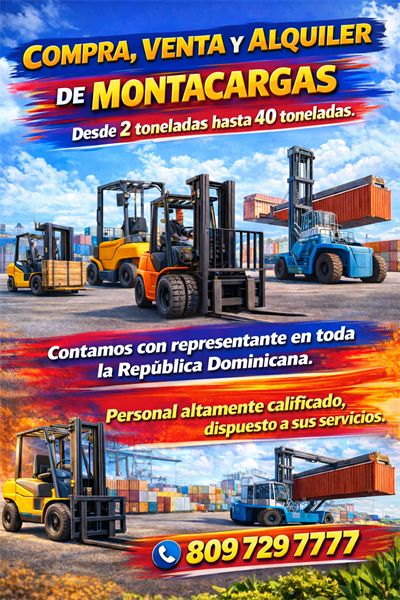 Somos una empresa que se dedica a la compra, venta y alquiler de toda clase de Montacargas desde 2 toneladas hasta 40 toneladas. Contamos con representante en Santo Domingo, Santiago y todo la República Dominicana. Laboramos 24 horas, los 7 días de la semana, además nuestro personal altamente calificado dispuesto a sus servicios, para ofrecerles los mejores precios del mercado. Tel 8097297777