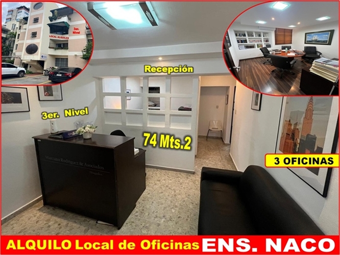LOCAL DE OFICINAS EN ALQUILER, ENS. NACO, 3 OFICINAS, RECEPCION, 74 Mts.2, 3er. NIVEL, con el mejor precio de la Zona