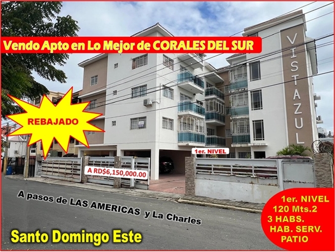 EL APTO ESTA UBICADO EN LA MEJOR ZONA DE CORALES DEL SUR, EDIFICIO VISTAZUL CON UNA MUY BUENA CONSTRUCCION, OCUPANDO EL 1ER. NIVEL DEL EDIFICIO, CON UN PEQUEÑO PATIO EN LA PARTE DE ATRÁS.