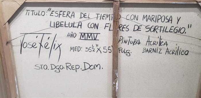 Vendo cuadro de JOSE FELIX MOYA, de 35 ½ ″ X 55 ″ TITULO: ESFERA DEL TIEMPO CON MARIPOSA Y LEBELULA CON FLORES DE SORTILEGIO, barniz acrílico, excelentes condiciones. US$3,900. Dólares, neg. 809-224-5051