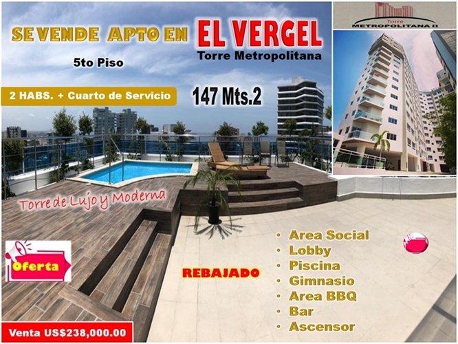 Vendo Apto en Torre moderna del VERGEL, 147 Mts.2, 2 HABS, 5to Piso, TORRE METROPOLITANA, REBAJADA