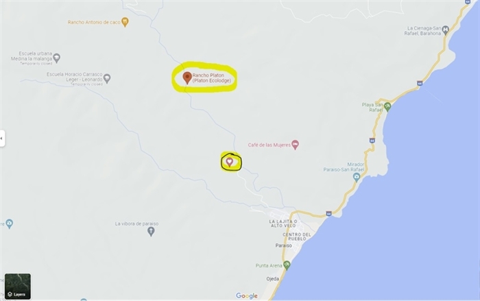Está ubicado en Las Montañas de Paraíso, Barahona, con Vista al Mar; A 3 kilómetros del Pueblo y a 5 kilómetros del Mar, con doble Acceso y con un Rio al lado.