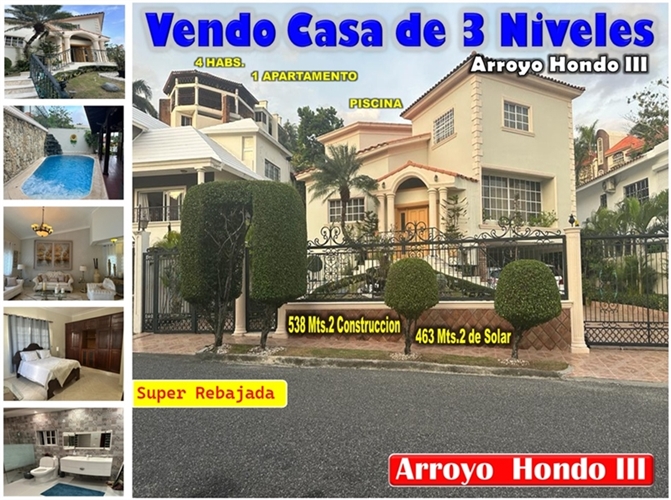 VENDO SUPER CASA DE 3 NIV. EN ARROYO HONDO III, CON TERMINACIONES DE PRIMERA, 4 HABS. + 1 APTO, REBAJADA
