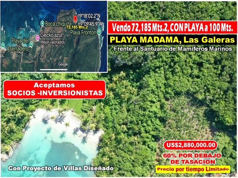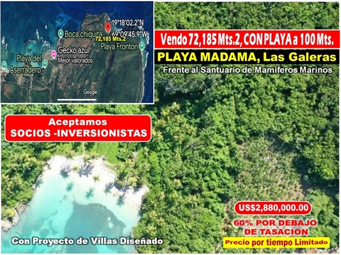 Vendo 72,185 Mts.2 CON PLAYA a 100 Mts. (Playa MADAMA), LAS GALERAS, 60% POR DEBAJO DE TASACION.
