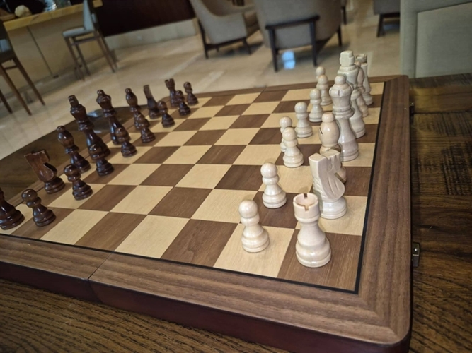 De madera y tipo estuche...se guardan sus piezas dentro!