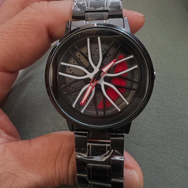 Este es un reloj de pulsera con diseño de aro de automóvil.