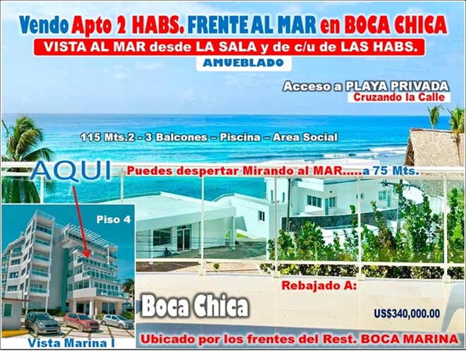 EL APARTAMENTO ESTA UBICADO EN EL 3ER. PISO DE LA TORRE VISTA MARINA I, LO MEJOR Y MAS COMPLETO DE BOCA CHICA, POR LOS FRENTES DEL RESTAURANTE BOCA MARINA Y ST TROPEZ.
