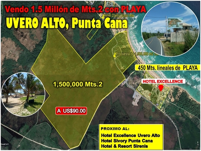 Vendo 1.5 Millón de Mts.2 CON PLAYA en UVERO ALTO o 900,000 o 600,000, PUNCA CANA, DE OPORTUNIDAD