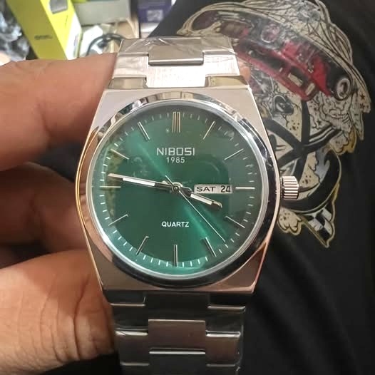 Reloj Nibosi 1985 con una esfera dial verde y correa de acero inoxidable.