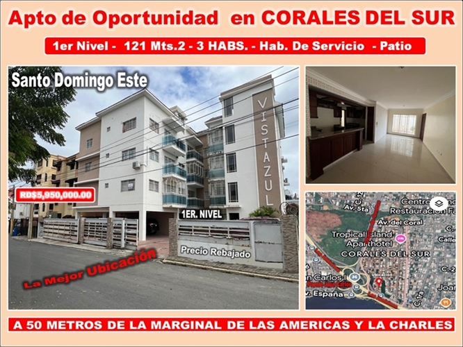 EL APTO ESTA UBICADO EN LA MEJOR ZONA DE CORALES DEL SUR, EDIFICIO VISTAZUL CON UNA MUY BUENA CONSTRUCCION, OCUPANDO EL 1ER. NIVEL DEL EDIFICIO, CON UN PEQUEÑO PATIO EN LA PARTE DE ATRÁS.