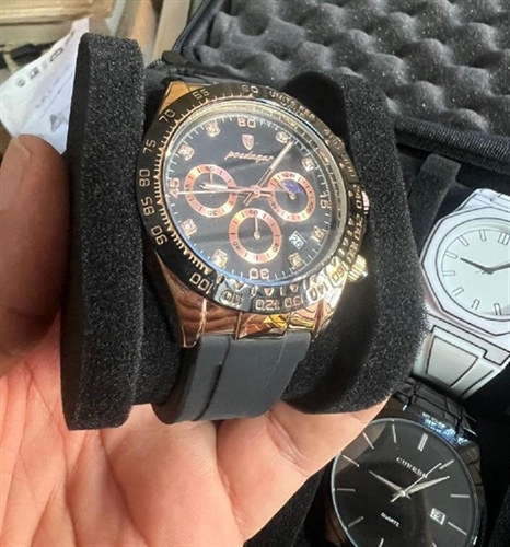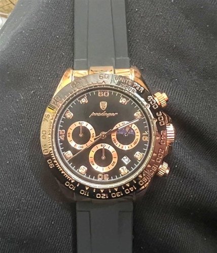 Diseño: Cuenta con una caja y detalles en tono oro rosa y una correa de silicona negra. El diseño del cronógrafo es un homenaje o tributo a modelos icónicos de alta gama, como el Rolex Daytona.