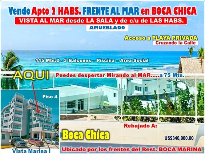 EL APARTAMENTO ESTA UBICADO EN EL PISO 4 DE LA TORRE VISTA MARINA I, LO MEJOR Y MAS COMPLETO DE BOCA CHICA, POR LOS FRENTES DEL RESTAURANTE BOCA MARINA Y ST TROPEZ.