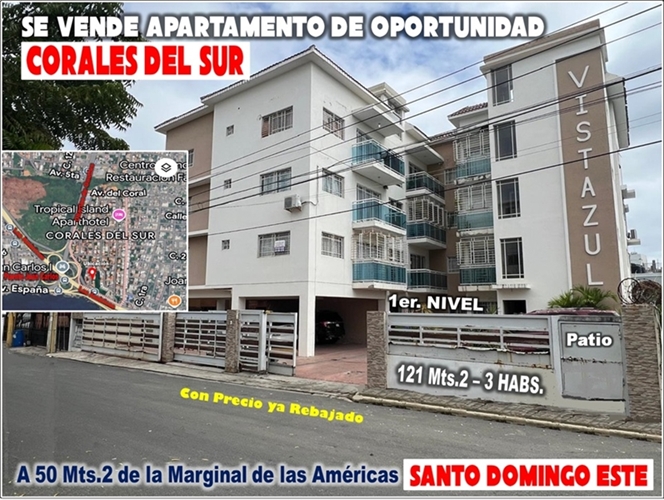 EL APTO ESTA UBICADO EN LA MEJOR ZONA DE CORALES DEL SUR, EDIFICIO VISTAZUL CON UNA MUY BUENA CONSTRUCCION, OCUPANDO EL 1ER. NIVEL DEL EDIFICIO, CON UN PEQUEÑO PATIO EN LA PARTE DE ATRÁS.