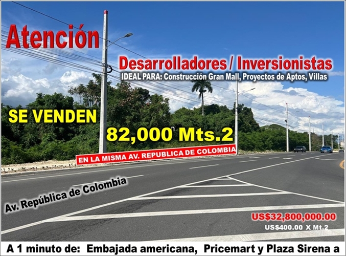 EL TERRENO ESTA UBICADO EN LA MISMA AV. REPUBLICA DE COLOMBIA, CON UNA UBICACIÓN PRIVILEGIADA: A 2 minutos de la Embajada Americana, a 2 de Patio Colombia, a 1 minuto de Pricemart, a 1 minuto de Plaza Sirena Market, y cerca de los Mejores Proyectos de la REPUBLICA DE COLOMBIA.
