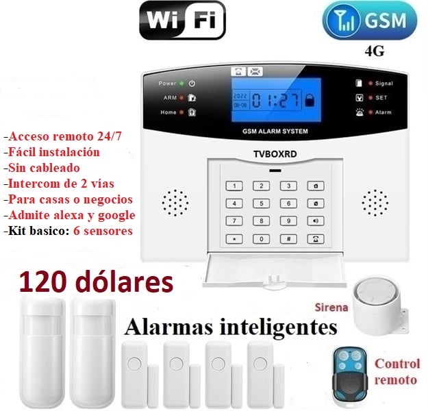 -Un kit incluye: Panel de control, una fuente, sensores de ventanas y puertas, sensores infra rojos de movimiento, sirena y control remoto para activar y desactivar la alarma desde 120 U$ o el equivalente en dólares