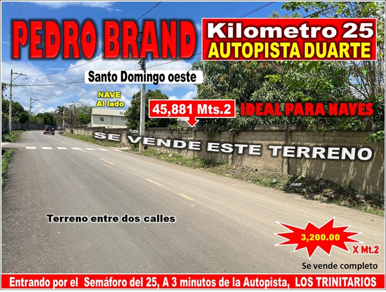 VENDO 45,881Mts.2 de Terreno en PEDRO BRAND, IDEAL PARA NAVES, CALLE ASFALTADA, a 3 minutos de la Autopista Duarte