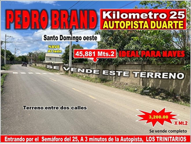 El Terreno está ubicado en PEDRO BRAND, Entrando por el SEMAFORO DEL KM. 25, a 3 minutos de la Autopista (Literal), en el Sector Los Trinitarios.
