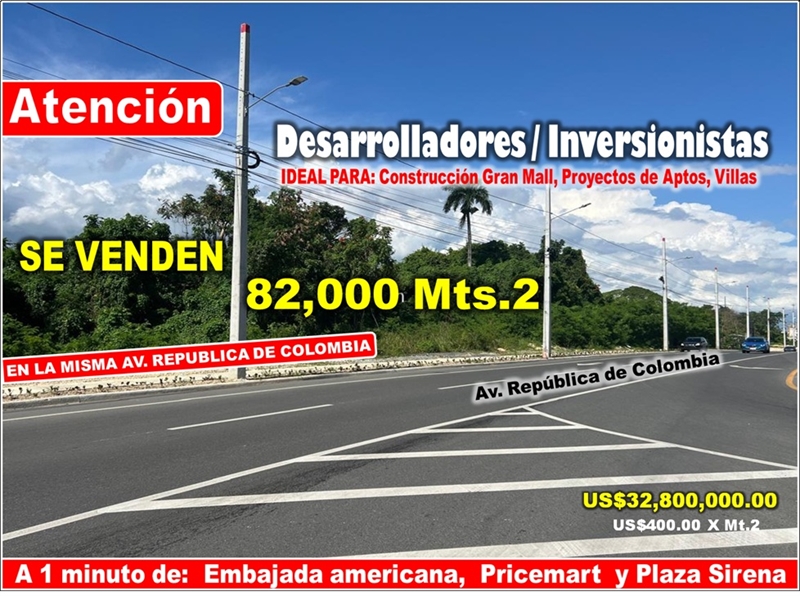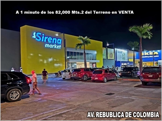 EL TERRENO ESTA UBICADO EN LA MISMA AV. REPUBLICA DE COLOMBIA, CON UNA UBICACIÓN PRIVILEGIADA: A 2 minutos de la Embajada Americana, a 2 de Patio Colombia, a 1 minuto de Pricemart, a 1 minuto de Plaza Sirena Market, y cerca de los Mejores Proyectos de la REPUBLICA DE COLOMBIA.