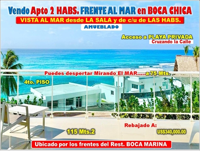 VENDO EXCLUSIVO APTO CON VISTA AL MAR DE 360 GRADOS EN BOCA CHICA, 2 HABS., 115 Mts.2, 3 BALCONES Y CON LA MEJOR UBICACIÓN